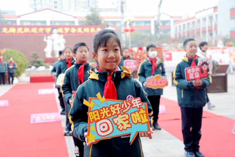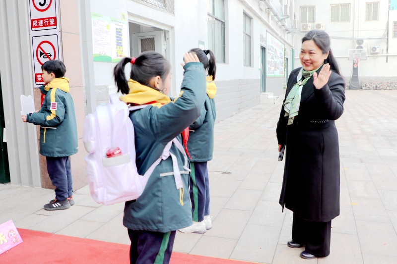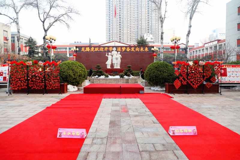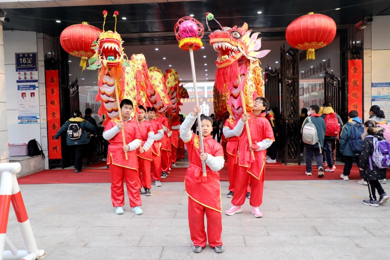 一大早,張麗(li) 娟校長率領領導班子成員喜氣洋洋地迎接緯五一學子返校。孩子們(men) 有序通過學生通道,沿著關(guan) 於(yu) “龍”字的成語紅毯進入學校。他們(men) 神采奕奕,自信滿滿,心懷憧憬與(yu) 期待,邁著愉快的步伐,踏上新一年的逐夢之旅。鑼鼓喧天,敲響了新學期揚帆起航;金龍賀歲,寓意著新學期輝煌再創;歡聲笑語,洋溢著大家對新學期的美好希冀。