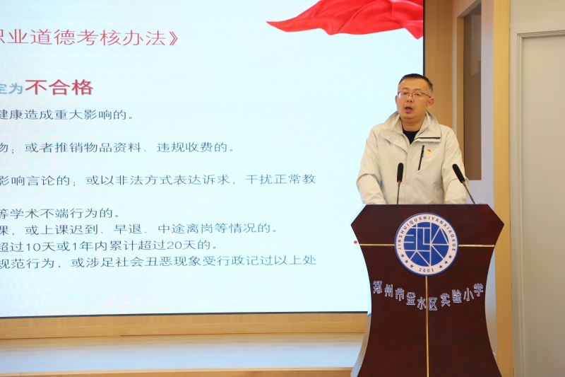學校黨(dang) 支部副書(shu) 記宋偉(wei) 帶領全校教師重溫《鄭州市中小學、幼兒(er) 園教師職業(ye) 道德考核辦法》,明確師德考核內(nei) 容,指出做一名合格、優(you) 秀教書(shu) 的努力方向,引導各位教師繼續樹立高尚的職業(ye) 理想,不斷提高思想政治素質和職業(ye) 道德水平,不斷提升人格修養(yang) 和學識修養(yang) ,增強教書(shu) 育人的榮譽感和使命感。