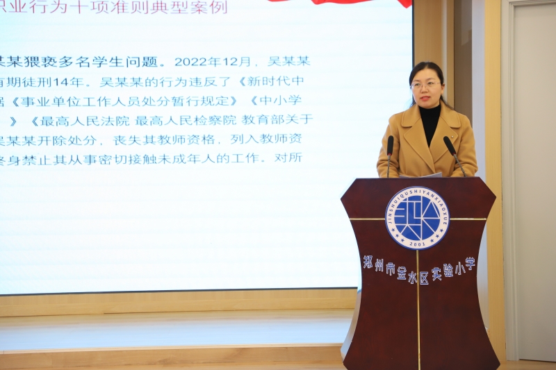 學校德育主任張麗(li) 娟帶領全體(ti) 教師學習(xi) 《教育部公開曝光7起違反教師職業(ye) 行為(wei) 十項準則典型案例》,結合典型案例,誡勉全體(ti) 教師嚴(yan) 格遵守教師行為(wei) 準則,規範執教行為(wei) ,做時刻自重、自省、自警、自勵,做以德立身、以德立學、以德施教的好老師。