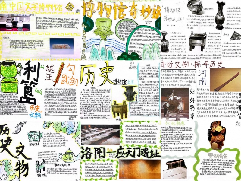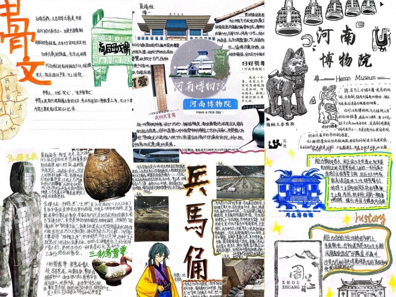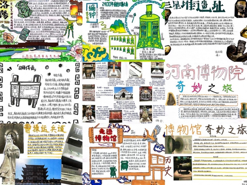 文物或許默默無言,但我們(men) 知道,它們(men) 有著獨特的心聲。老師號召同學們(men) 用曆史小報的形式圖文並茂地展示自己的博物館奇妙之旅。同學們(men) 為(wei) 讓曆史小報增添更多生動的元素,紛紛走進二裏頭博物館、河南博物院、三星堆遺址等各大博物館,或聆聽講解員的精彩講解,或駐足展品前細心觀察,或翻閱資料深入了解,用心感受著曆史的厚重和文化的瑰麗(li) 。