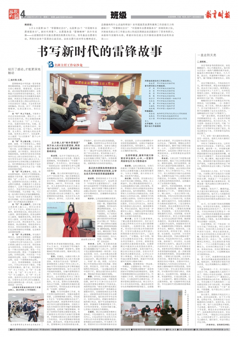 多維聯動育人,構建課程體(ti) 係。課程是教育的主要載體(ti) ,通過課程建設學習(xi) 傳(chuan) 承雷鋒精神,是學校的應然選擇。學校聯合南陽師範學院馬克思主義(yi) 學院教授,推動雷鋒精神融入大中小學思政課一體(ti) 化建設,進一步完善思政課程內(nei) 容體(ti) 係、實施體(ti) 係,讓學習(xi) 雷鋒精神貫穿教育全過程。學校在各學科教學中融合、滲透雷鋒精神教育,形成全員宣貫雷鋒精神、全學科宣貫雷鋒精神格局,發揮課程思政功能。學校以河南省裴淩霄名班主任工作室為(wei) 依托,采用學生喜聞樂(le) 見、易於(yu) 接受的形式,係統開發精品課程,構建線上線下、課內(nei) 課外相結合的德育體(ti) 係,使學雷鋒在“有意思”中變得更“有意義(yi) ”。