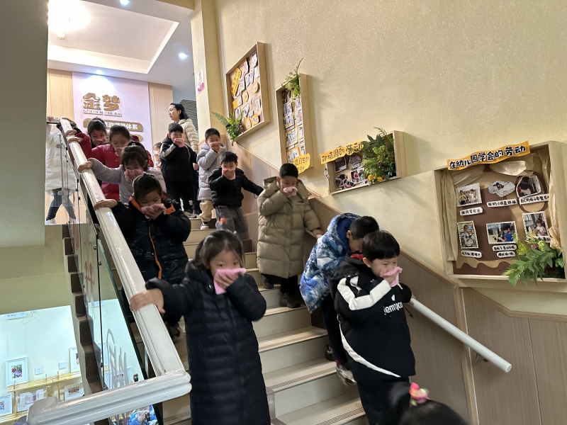 消防演練開始後,班級老師迅速組織孩子們(men) 站隊清點人數,保育老師快速將打濕的毛巾發給孩子,並帶領孩子用濕毛巾捂住口鼻,彎腰俯身,按照預定應急疏散逃生路線進行緊急撤離,班主任站孩子隊伍最前麵,配班老師站孩子隊伍中間,保育老師站隊尾,確保關(guan) 注到每一個(ge) 孩子。全園幼兒(er) 及教師撤離到安全地帶用時3分15秒。