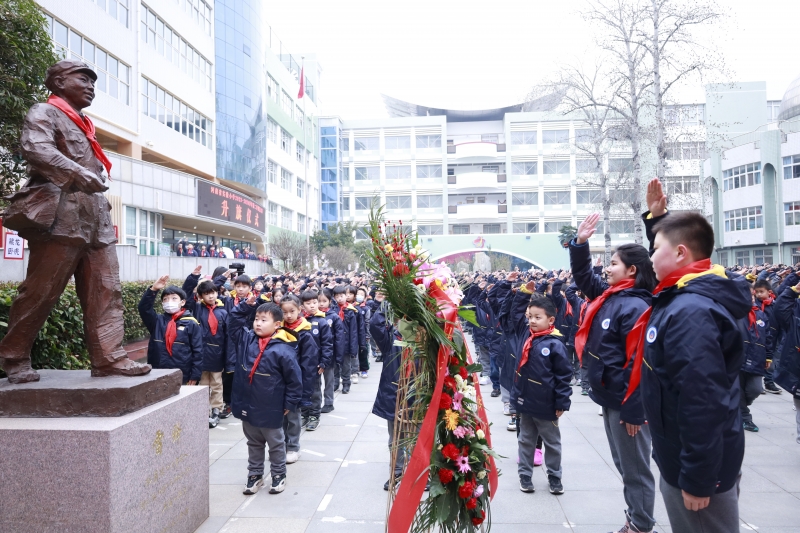 學雷鋒主題升旗儀(yi) 式上,五(11)班學生陳伯愷、趙馨彤、相承佑、張子楠發表國旗下演講《雷鋒精神永放光芒》,號召同學們(men) 與(yu) 他們(men) 一同砥礪前行,用雷鋒精神勉勵自我,將雷鋒精神傳(chuan) 承下去。隨後,少先隊員代表朱子健、方嘉雯向雷鋒雕像獻花敬禮,全體(ti) 師生合唱《學習(xi) 雷鋒好榜樣》。最後,學雷鋒優(you) 秀少先隊員代表趙芮暄帶領全體(ti) 同學宣誓學雷鋒誓詞。