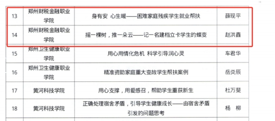 近日,鄭州市教育局辦公室發布了《關(guan) 於(yu) 公布2023年度鄭州地方高校輔導員工作優(you) 秀案例評選結果的通知》(鄭教高函〔2024〕126號),《關(guan) 於(yu) 公布2023年鄭州地方高校優(you) 秀輔導員名單的通知》(鄭教高函〔2024〕127號)。其中,鄭州財稅金融職業(ye) 學院薛現平老師撰寫(xie) 的《身有安心生暖——困難家庭殘疾學生就業(ye) 幫扶》、趙洪鑫老師撰寫(xie) 的《搖一棵樹,推一朵雲(yun) ——記一名建檔立卡學生的蝶變》榮獲2023年度鄭州地方高校輔導員工作優(you) 秀案例,李旋老師榮獲2023年鄭州地方高校優(you) 秀輔導員。