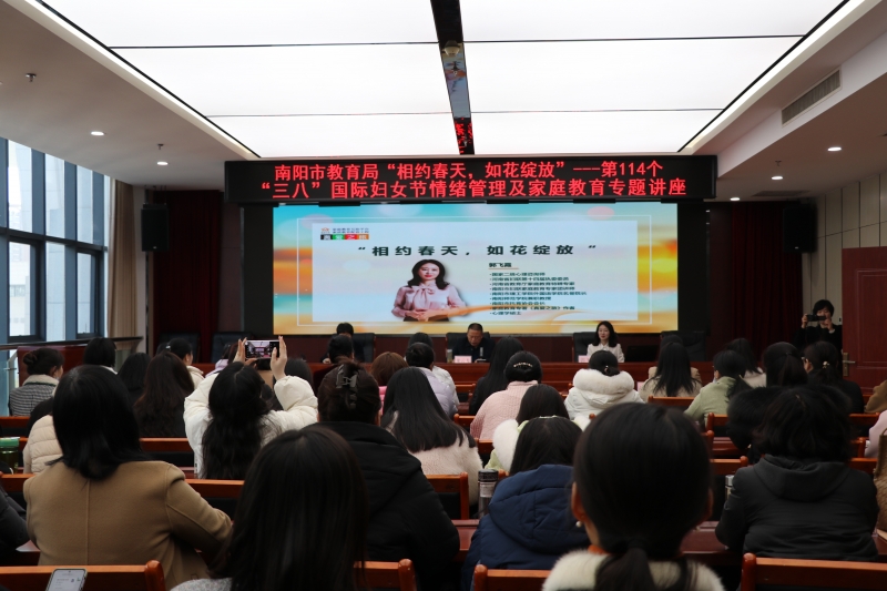 春光明媚,惠風和暢。為(wei) 慶祝第114個(ge) “三八”國際婦女節,3月8日上午,南陽市教育局以“相約春天,如花綻放”為(wei) 主題,特邀國家二級心理谘詢師、kaiyun体育登入口家庭教育講師團核心講師、南陽市著名家庭教育專(zhuan) 家郭飛霞做專(zhuan) 題講座,讓局屬教育係統女同誌過了一個(ge) 別開生麵、內(nei) 涵豐(feng) 富、意義(yi) 深刻的節日。南陽市教育局黨(dang) 組成員、副局長龍雲(yun) 飛主持會(hui) 議;市委教育工委專(zhuan) 職委員李莉出席並講話;市教育局機關(guan) 、局屬單位女同誌和局屬各學校(幼兒(er) 園)女職工代表參加會(hui) 議。