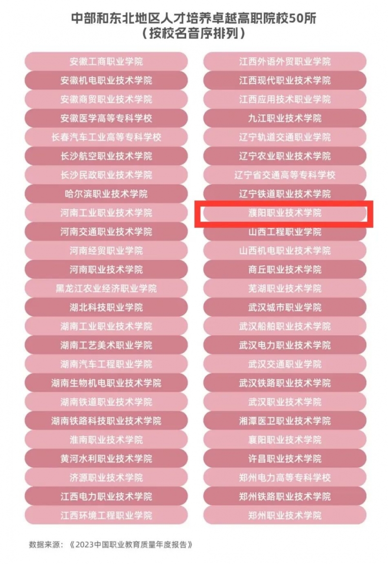 由中國教育科學研究院編著、高等教育出版社出版的《2023中國職業(ye) 教育質量年度報告》,發布了2023年東(dong) 部地區、中部和東(dong) 北地區、西部地區各50所人才培養(yang) 卓越高職院校名單,河南共計12所院校入圍,濮陽職業(ye) 技術學院位列其中。 年度報告基於(yu) 職業(ye) 教育的人才培養(yang) 投入、過程和成果相關(guan) 指標數據,采用因子分析法確定指標權重,對高等職業(ye) 學校人才培養(yang) 投入(包括辦學條件、師資隊伍和教學資源等3項二級指標)、人才培養(yang) 過程(包括專(zhuan) 業(ye) 設置、技能培養(yang) 和教學評價(jia) 等3項二級指標)和人才培養(yang) 成果(包括技能水平、創新能力、就業(ye) 質量和職業(ye) 發展等4項二級指標)三大維度的34項末級指標觀測點,綜合計算得出東(dong) 部地區、中部和東(dong) 北地區、西部地區各50所人才培養(yang) 卓越高等職業(ye) 學校。 此次濮陽職業(ye) 技術學院入圍人才培養(yang) 卓越高職院校榜單,充分展現了我校“雙高”建設的成效。下一步,學校將持續推進職普融通、產(chan) 教融合、科教融匯,深化現代職業(ye) 教育體(ti) 係建設改革,提升地區服務能力和辦學育人水平,推動學校各項事業(ye) 高質量發展。