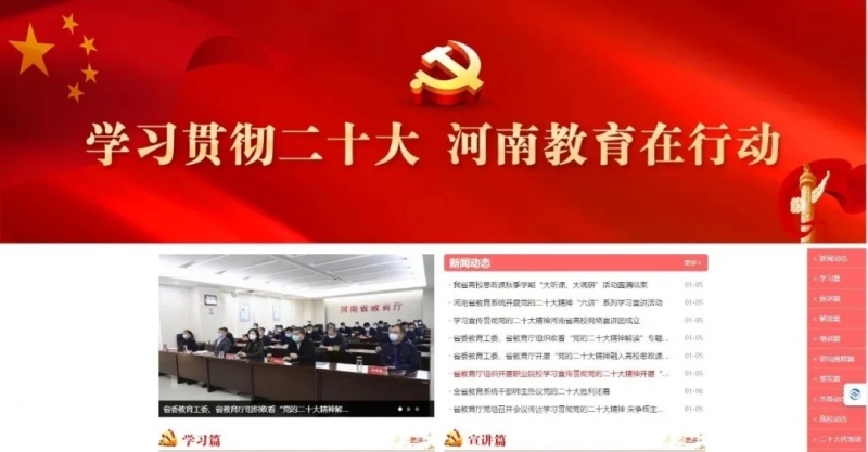 唱響宣傳(chuan) 貫徹黨(dang) 的二十大精神主旋律。省教育廳網站開設“學習(xi) 貫徹二十大,河南教育在行動”專(zhuan) 題網頁,在加強解讀、宣講的同時,更注重報道各地在貫徹落實方麵的務實舉(ju) 措和有力行動。