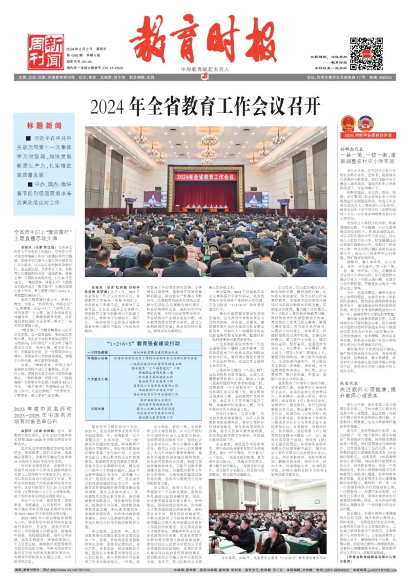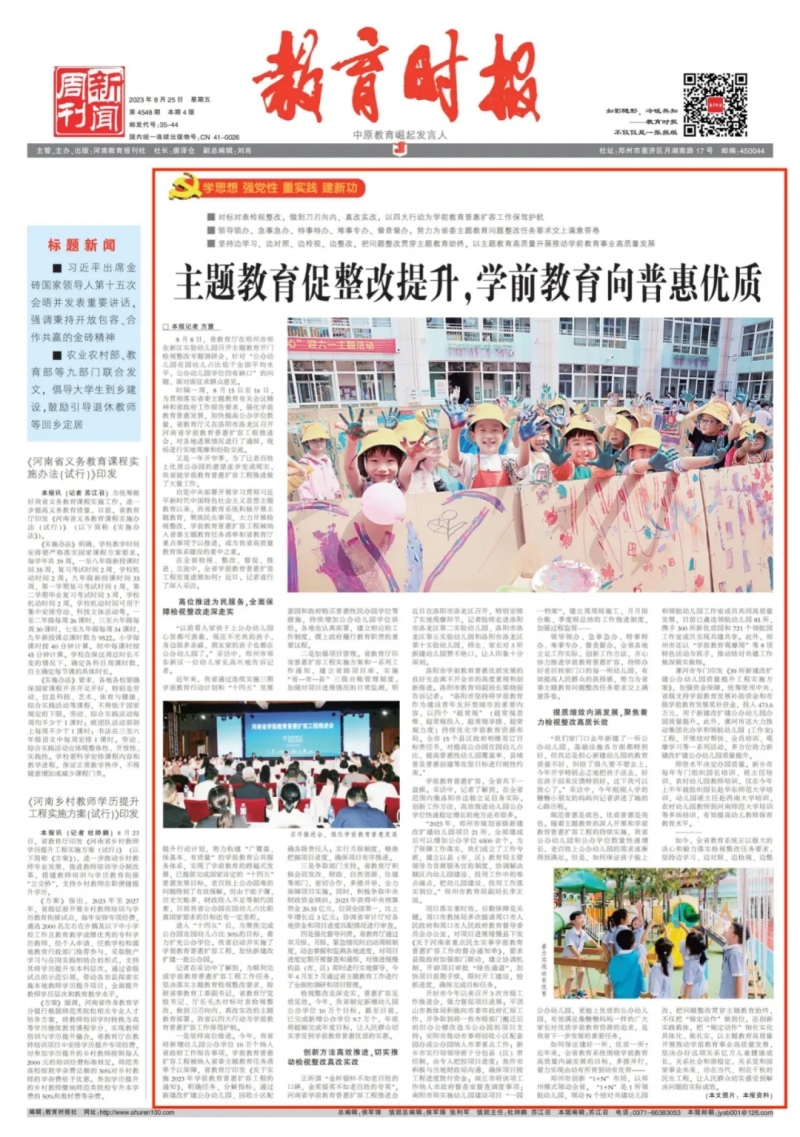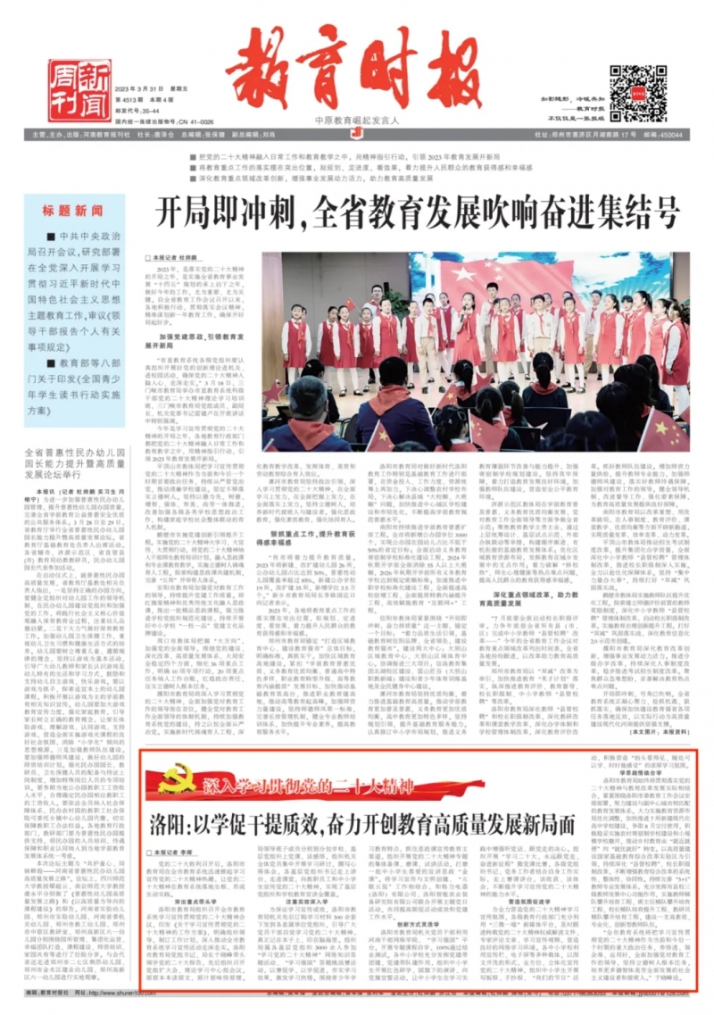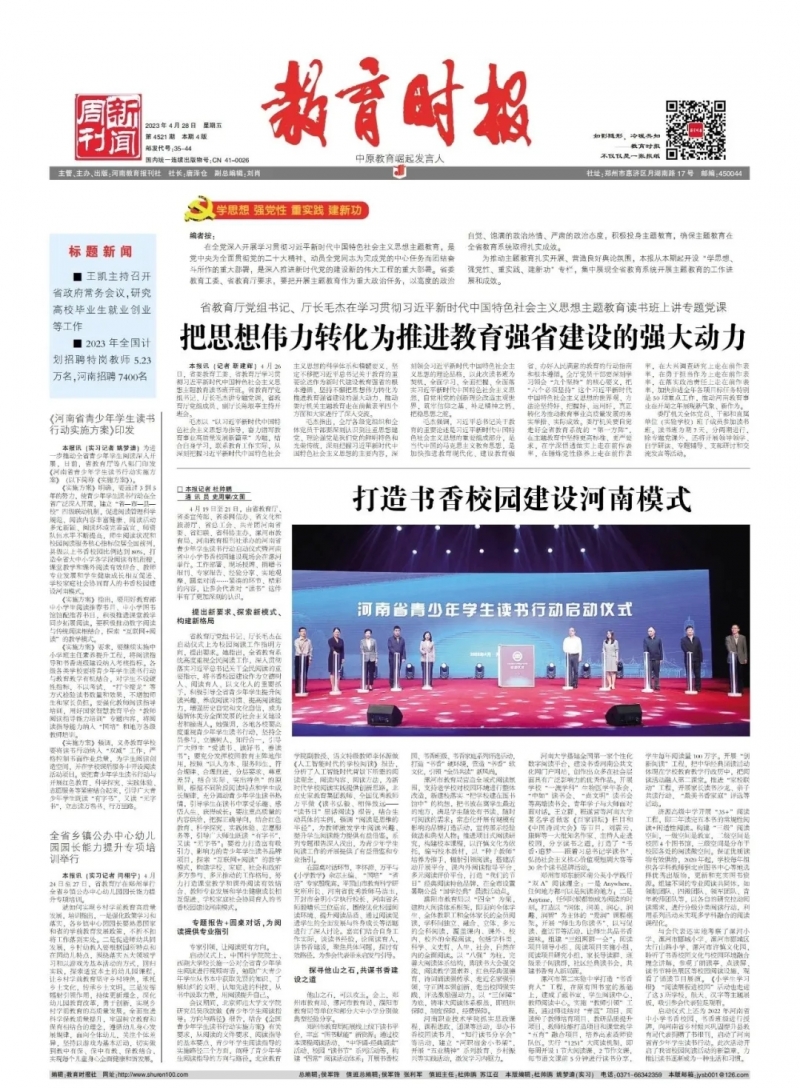 《教育時報》先後推出“‘雙減’的河南行動”“課後服務的河南示範”“學前教育的河南實踐”等多個(ge) 係列報道,開設《普通高中學科基地建設》《走進高中多樣化發展示範校》《聚焦高中新課程新教材》等專(zhuan) 欄,全方位關(guan) 注我省教育改革發展的典型經驗和創新探索。