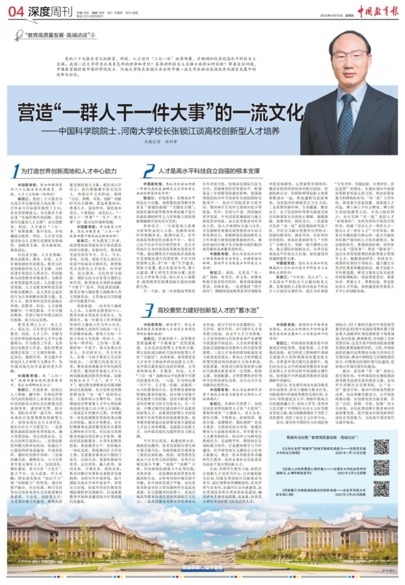 《中國教育報》專(zhuan) 訪全國人大代表、中國科學院院士、河南大學校長張鎖江的報道,在“教育高質量發展高端訪談”欄目重磅推出,展現了河南高等教育在推動科技自立自強、服務國家戰略和地方經濟發展方麵的重要貢獻。