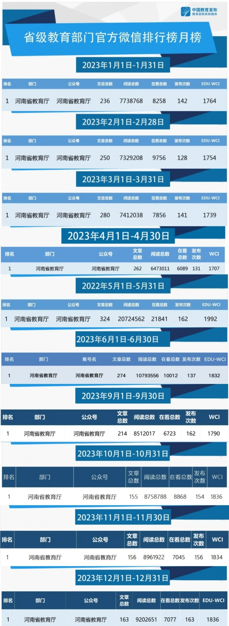 新媒體(ti) 工作創新出彩。省教育廳政務新媒體(ti) 平台從(cong) 內(nei) 容策劃到發布次數,再到聯動矩陣,重點突出政務功能,兼顧社會(hui) 功效。省教育廳微信公眾(zhong) 號粉絲(si) 達到1540萬(wan) ,共推送2810篇文章,總閱讀量達1.3億(yi) 次,10萬(wan) +文章達到295篇,在教育部發布的省級教育部門微信排行榜中連續多個(ge) 月度排名第一;省教育廳微博粉絲(si) 219萬(wan) ,日均發布15條;推進短視頻平台提質進位,省教育廳抖音號粉絲(si) 142萬(wan) ,省教育廳快手號粉絲(si) 272萬(wan) ,省教育廳微信視頻號粉絲(si) 276.2萬(wan) ,三個(ge) 平台日均發布各5條。