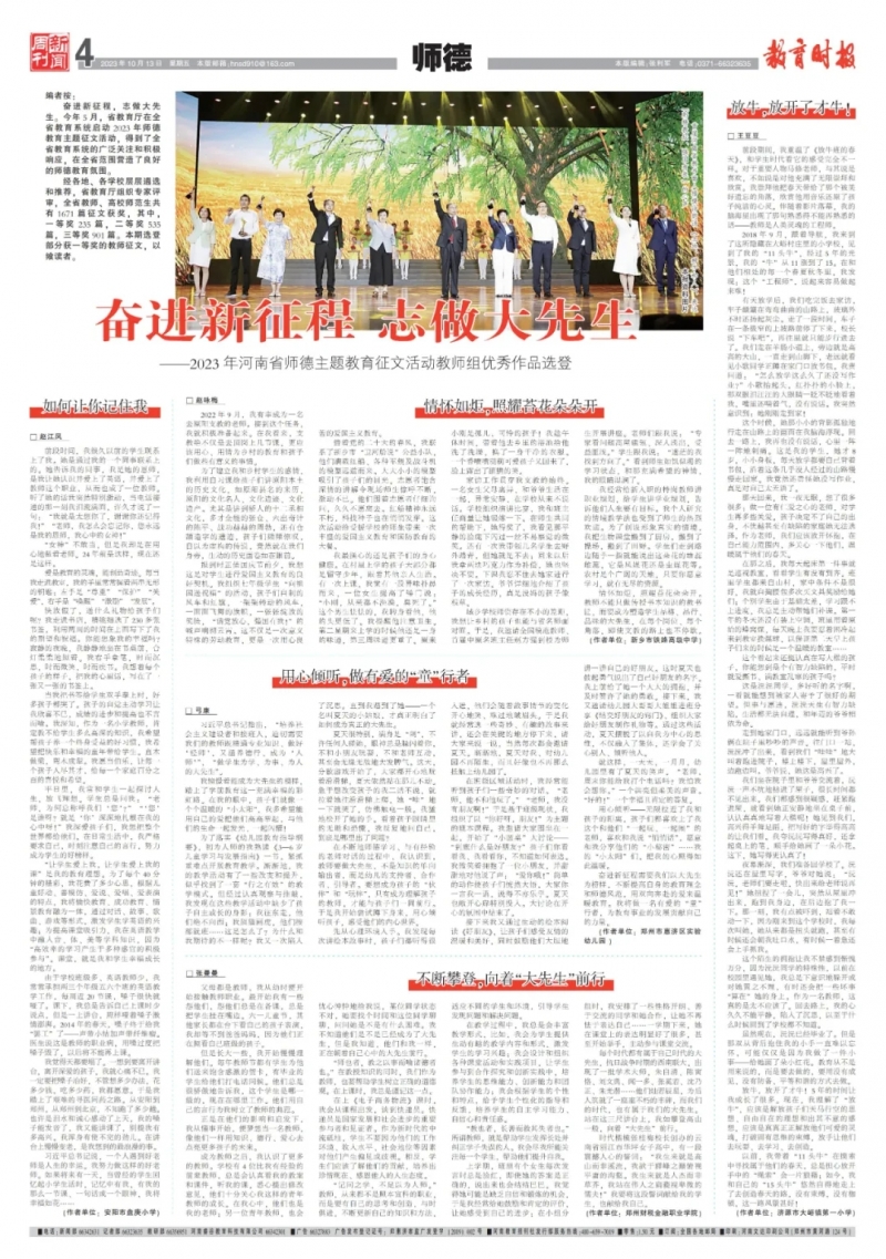 2023年,我省在“出彩河南人”最美教師宣傳(chuan) 推介的同時,選樹12位首屆河南省教書(shu) 育人楷模,在教師節表彰大會(hui) 上隆重發布,全省媒體(ti) 重點宣傳(chuan) ,在教育係統掀起學最美、做楷模的熱潮。