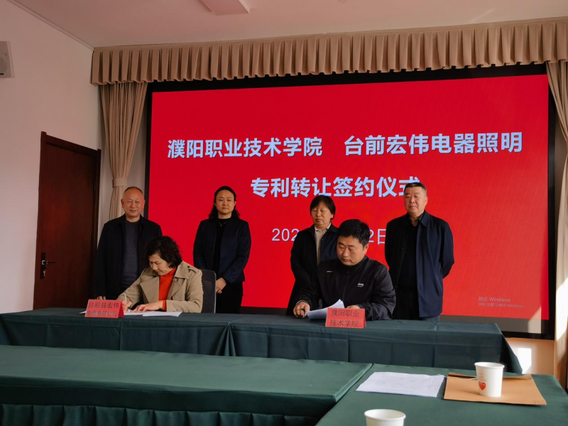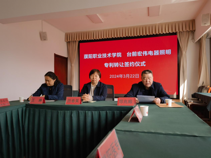 3月22日,台前縣宏偉(wei) 電器照明有限公司與(yu) 濮陽職業(ye) 技術學院專(zhuan) 利技術轉讓合同簽約儀(yi) 式在濮陽市市場監管局舉(ju) 行。本次專(zhuan) 利轉讓合同簽約為(wei) 濮陽職業(ye) 技術學院教師陳保山發明的實用新型專(zhuan) 利——汽車機械三角臂總成支撐裝置。