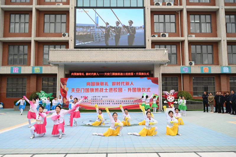 升旗儀(yi) 式前,同學們(men) 表演暖場舞蹈《吉祥如意》,用最純真的心靈、最真摯的情感,將吉祥如意的祝福從(cong) 每一個(ge) 動作中表達出來。