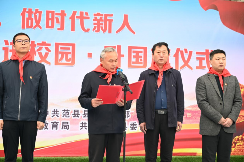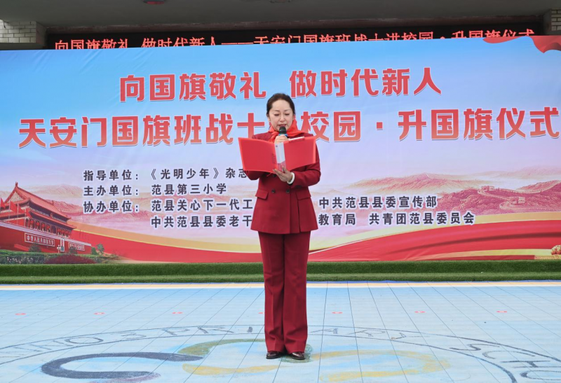 隨後,範縣政協二級調研員、縣關(guan) 工委副主任榮玉清發表致辭,勉勵孩子們(men) 以此次天安門國旗授予儀(yi) 式為(wei) 契機,珍惜這份榮譽、肩負起這份責任,以更加飽滿的熱情和更加堅定的信念投入到學習(xi) 和生活中去,為(wei) 祖國的繁榮富強貢獻自己的力量。