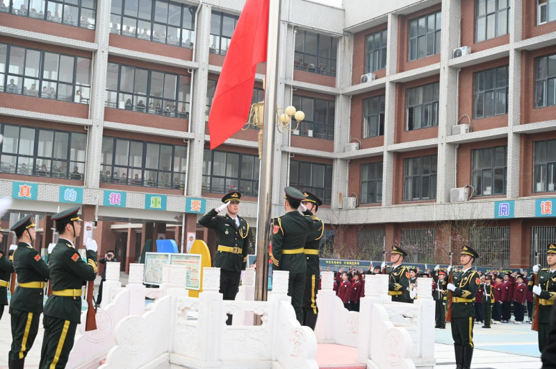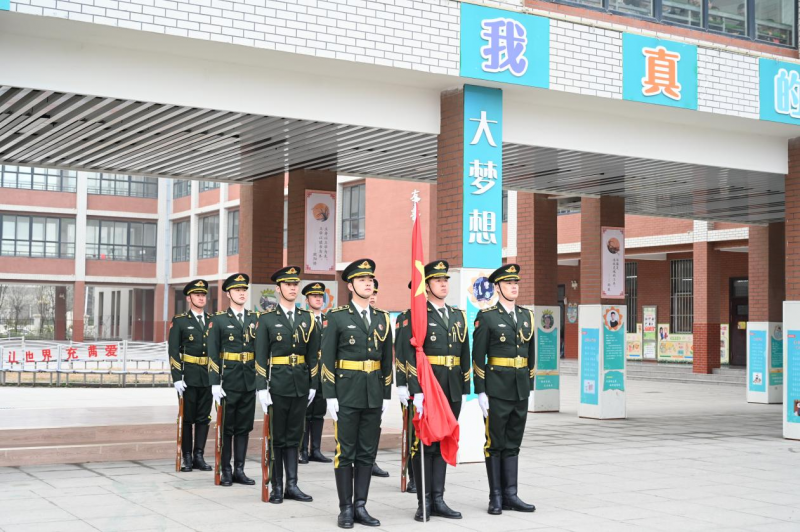 升旗儀(yi) 式上,精神抖擻、英姿颯爽的國旗班戰士,邁著堅定的步伐,高舉(ju) 著五星紅旗,莊嚴(yan) 地走向升旗台。全校師生齊唱國歌。在雄壯有力的歌聲裏,擎旗手將國旗拋向空中。全體(ti) 師生肅然而立,向冉冉升起的國旗敬禮。