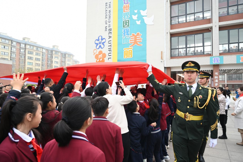 升旗儀(yi) 式結束後,天安門國旗班戰士進行隊列展示,同時將編號為(wei) “2023年08月01日”的天安門國旗高高舉(ju) 起,從(cong) 學生方陣緩緩走過,孩子們(men) 心中滿是讚歎和欣喜,紛紛伸手觸摸國旗。濃濃的愛國情懷在孩子們(men) 心裏傳(chuan) 遞,一顆顆愛國愛黨(dang) 的種子也在他們(men) 心中生根發芽。孩子們(men) 舉(ju) 起右拳,莊嚴(yan) 宣誓:請黨(dang) 放心,強國有我!也祝願我們(men) 偉(wei) 大的祖國繁榮昌盛、國泰民安!