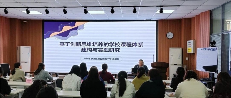 第一環節,經驗分享環節。惠濟區第五初級中學副校長孔繁軍(jun) 以《基於(yu) 創新思維培養(yang) 的學校課程體(ti) 係建構與(yu) 實踐研究》為(wei) 題,做了課題經驗交流。