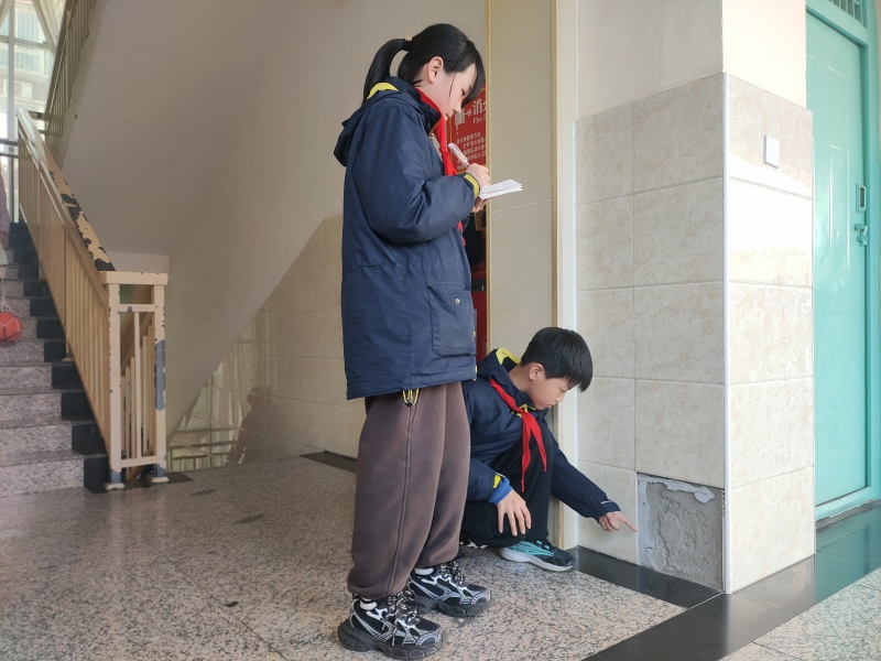 “兒(er) 童友好觀察團”在學校德育處的組織下,進行地毯式排查。同學們(men) 仔細檢查小花園的木質長凳,看木條有無鬆動、釘子是否有凸起;巡查小魚池旁邊的路麵,看路石有無掉落,地麵是否平整;打開消防箱,檢查消防器材有無損壞,是否在保質期內(nei) ,消防箱有無破損;逐樓層排查地麵瓷磚、牆麵瓷片有無破損,是否及時上報;還有教師電動車存放處、配餐室、校園圍牆、盥洗池的水龍頭,功能室的各種器材設備,教師辦公室的電器使用情況……每一個(ge) 小觀察員都睜大了雙眼,恨不得用放大鏡把整個(ge) 校園都仔細地觀察一遍。同學們(men) 把發現的問題——記錄下來匯總給學校,並寫(xie) 下了自己的意見和建議。
