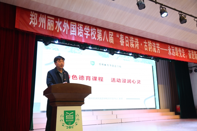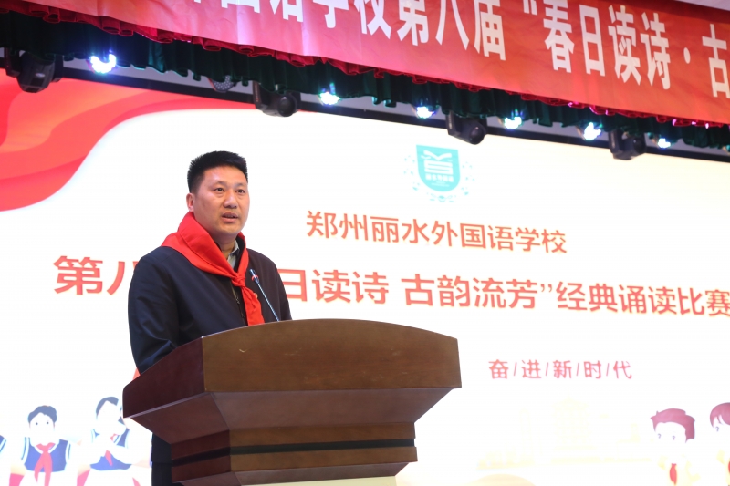 鄭州麗(li) 水外國語學校校長餘(yu) 自甫代表學校對蒞臨(lin) 現場觀摩指導的各位領導和來賓表示熱烈的歡迎,並指出:“國學經典是中華民族優(you) 秀傳(chuan) 統文化中的瑰寶,中華兒(er) 女有責任、有義(yi) 務去學習(xi) 她的博大精深、發揚她的精神內(nei) 涵、傳(chuan) 承她的優(you) 秀美德。從(cong) 國學經典的閱讀和吟誦中,可以擴充知識視野、增加文化涵養(yang) 、領悟做人道理、提升自我境界。”