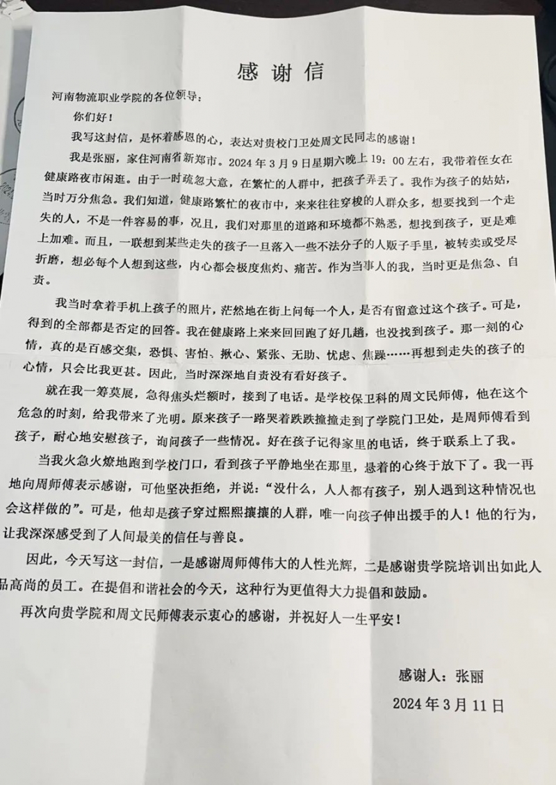 近日,河南物流職業(ye) 學院收到這樣一封表揚信 ,信中表達了對河南物流職業(ye) 學院鄭州校區保衛處周文民師傅幫助走失兒(er) 童的感激之情。