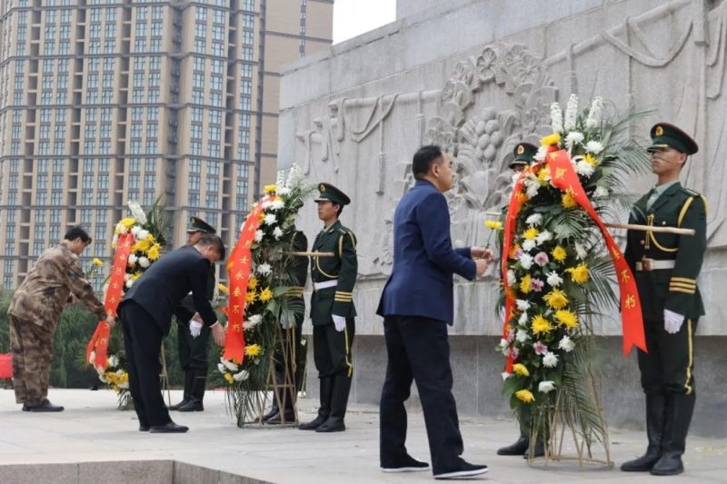 在《獻花曲》的伴奏下,6名國旗護衛隊隊員向革命烈士紀念碑敬獻花籃,共青團市委副書(shu) 記馬慶華、鄭州市教育局宣外處處長雷剛、鄭州市國防科技學校校長張凱共同上前整理挽聯。儀(yi) 式結束後,全體(ti) 與(yu) 會(hui) 人員依次緩步繞行,瞻仰烈士紀念碑,並追思他們(men) 英勇無畏、不怕犧牲的革命精神。