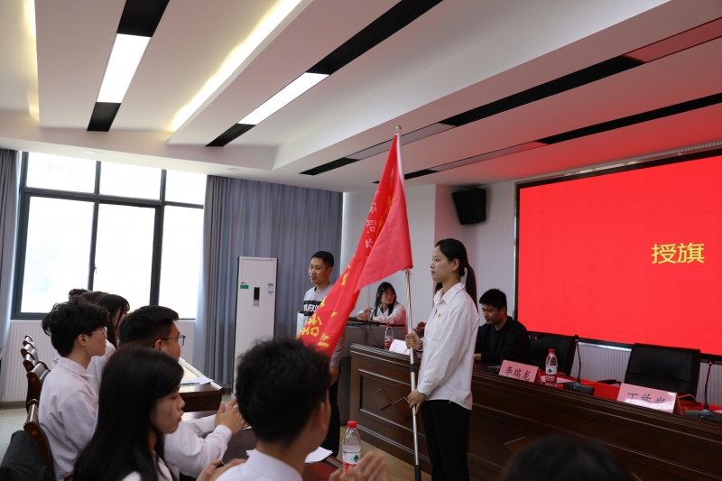 校團委書(shu) 記李瑞龍為(wei) “青馬工程”培養(yang) 班授旗。