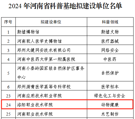 近日,河南省科學技術廳公布2024年河南省科普基地擬建設單位名單,洛陽職業(ye) 技術學院成功入選。