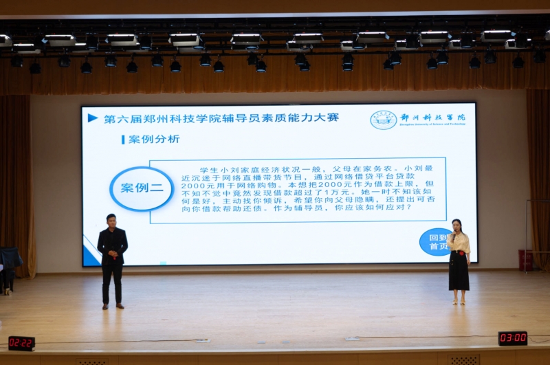 “大學新生小馬被網絡詐騙5000元,情緒很低落,輔導員該如何做好思想工作。”“學生小葉失戀後不去上課,不參加集體(ti) 活動,作為(wei) 輔導員,你該如何與(yu) 學生交流?”4月3日,鄭州科技學院第六屆輔導員素質能力大賽落下帷幕。通過初賽、複賽、決(jue) 賽,經過基礎知識測試、案例研討、談心談話等環節,錘煉了輔導員的理論水平、專(zhuan) 業(ye) 素養(yang) 和職業(ye) 能力,推動學校思想政治工作的高質量發展,助力大學生成長成才。