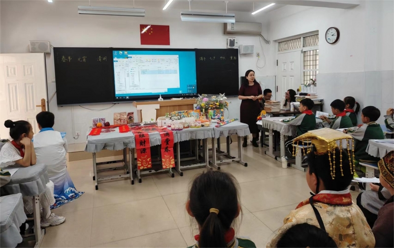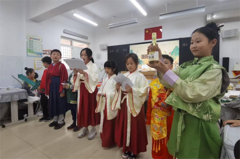 走進三(3)班的教室,講台前擺滿了不同傳(chuan) 統節日享用的美食,學生穿著各式各樣的服飾圍坐在一起。7個(ge) 小組依次上台,他們(men) 有的演繹與(yu) 傳(chuan) 統節日相關(guan) 的故事與(yu) 傳(chuan) 說,有的講述傳(chuan) 統節日的風俗習(xi) 慣,有的吟誦和傳(chuan) 統節日有關(guan) 的詩詞……學生展示的內(nei) 容豐(feng) 富多樣,精彩紛呈。
