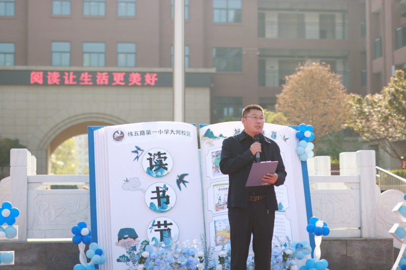 緯五路第一小學大河校區史明輝副校長為(wei) 儀(yi) 式致辭。他鼓勵同學們(men) 積極行動起來,以好書(shu) 為(wei) 友,以讀書(shu) 為(wei) 樂(le) ,在好書(shu) 的陪伴下邁向更精彩的人生。