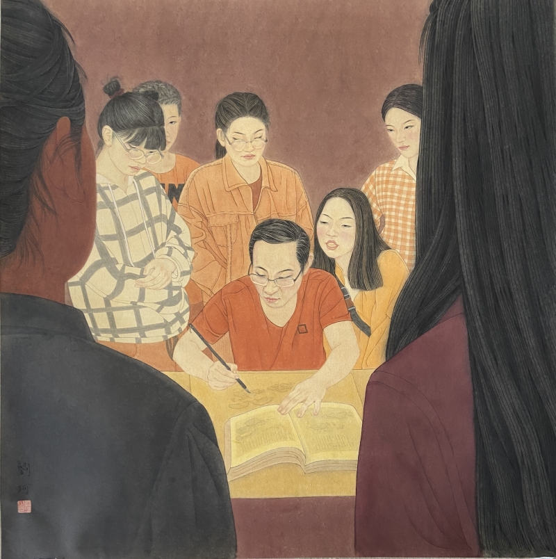 《示範課》是栗東(dong) 旭老師指導學生劉珂創作的表現課堂教學場景的中國畫作品,圖中描繪的是黃淮學院藝術設計學院翟凱威老師為(wei) 美術學專(zhuan) 業(ye) 學生上專(zhuan) 業(ye) 技能示範課的情景。