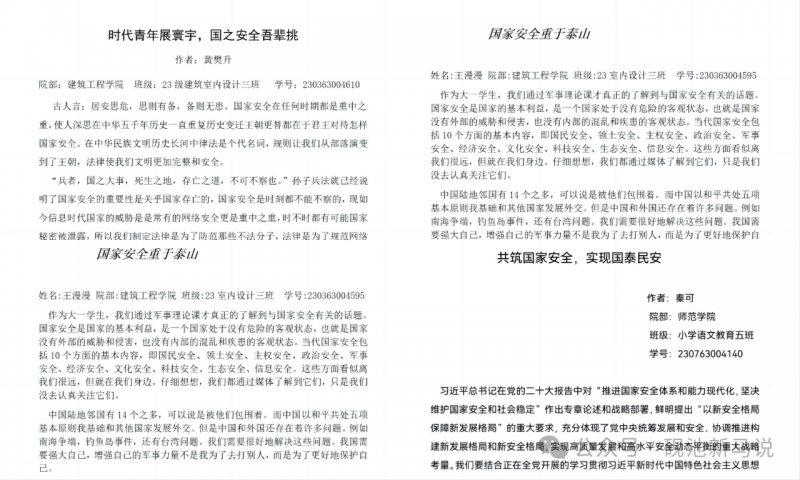 為(wei) 了進一步加深學生對國家安全知識的理解和認知,提高學生的國家安全意識,國防教育教研室結合《國家安全教育》課程教學,開展了富有實踐意義(yi) 的國家安全教育主題優(you) 秀網文征集活動。這項活動旨在通過激發學生的創作熱情和思維活力,引導他們(men) 主動關(guan) 注國家安全問題,結合課堂所學知識進行深入思考,增強維護國家安全的責任感和使命感。同時,通過征集優(you) 秀網文,也可以促進學生之間的交流和學習(xi) ,營造濃厚的國家安全教育氛圍。
