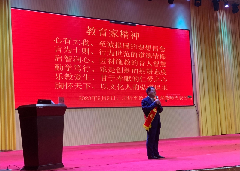在報告會(hui) 上, 張玉滾以《弘揚教育家精神,爭(zheng) 做時代“大先生”》為(wei) 題,結合工作經曆,滿懷深情地講述了自己作為(wei) 一名共產(chan) 黨(dang) 員和人民教師,紮根偏僻山村20餘(yu) 年,愛護學生、專(zhuan) 心教學、默默堅守在基層教育一線的經曆和事跡,生動詮釋了育人崇德、師者匠心的深刻內(nei) 涵。他誓言要和各位教師一起努力提高綜合素質,大力弘揚教育家精神,樹立“躬耕教壇,強國有我”的誌向和抱負,用大愛書(shu) 寫(xie) 教育人生,為(wei) 鄉(xiang) 村教育振興(xing) 貢獻力量。