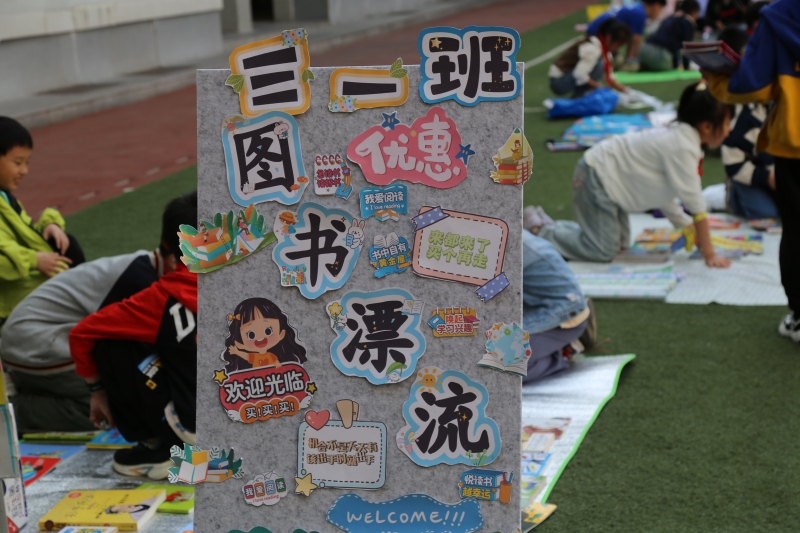 圖書(shu) 漂流活動在同學們(men) 的熱切期盼中拉開帷幕,一至六年級同學們(men) 在操場齊聚,“攤主”們(men) 在老師的帶領下精心布置自己的攤位。為(wei) 了吸引同學們(men) 前來淘書(shu) 換書(shu) ,“攤主”們(men) 做足了功課,別具特色的攤名、五彩繽紛的宣傳(chuan) 畫、別出心裁的廣告語、琳琅滿目的書(shu) 本,把操場裝點得別具書(shu) 香韻味。