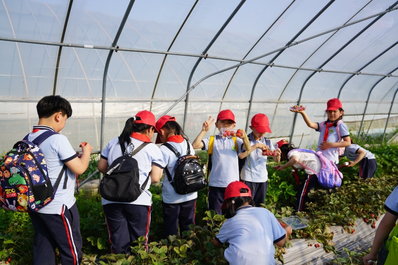 不知不覺,同學們(men) 走進了今日研學課程的最後一站—探索節氣奧秘,品嚐節氣美食。研學導師向學生們(men) 講解了二十四節氣指導農(nong) 事活動的重要性和春耕秋種的具體(ti) 步驟,接著,同學們(men) 在老師們(men) 的帶領下走進了草莓種植園,采摘、品嚐草莓,身體(ti) 力行地體(ti) 驗著豐(feng) 收的喜悅,品嚐著勞動的甜蜜。
