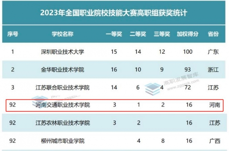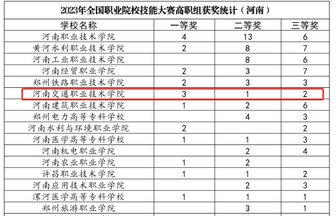 近日,全國職業(ye) 院校技能大賽執行委員會(hui) 正式公示了2023年全國職業(ye) 院校技能大賽獲獎名單。根據高職組獲獎名單統計,河南交通職業(ye) 技術學院成績斐然,榮獲3個(ge) 一等獎,1個(ge) 二等獎、2個(ge) 三等獎,在全國獲獎的847所高職院校中位居第92名,河南省第6名。