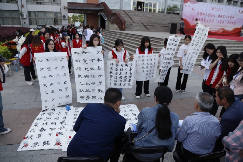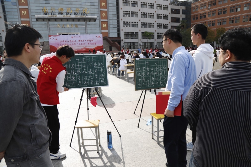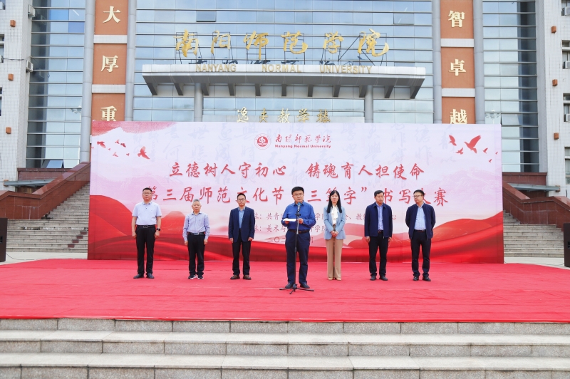為(wei) 加強師範教育,擦亮師範特色,提升學子的漢字書(shu) 寫(xie) 水平,4月17日下午,南陽師範學院第三屆師範文化節“三筆字”大賽決(jue) 賽在逸夫樓東(dong) 廣場舉(ju) 行。副校長劉紅林出席活動。