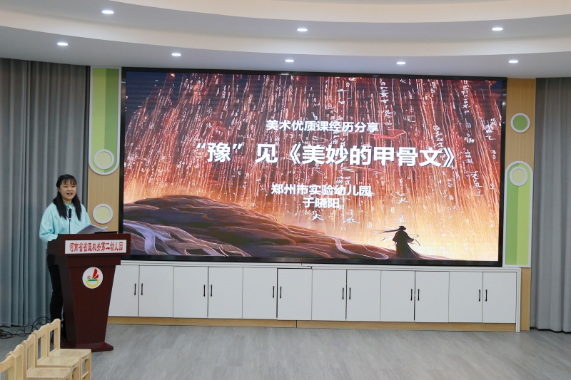 首先帶著集體(ti) 教學活動研討的兩(liang) 個(ge) 問題,觀看了鄭州市實驗幼兒(er) 園於(yu) 曉陽老師榮獲2023年河南省優(you) 質課一等獎的大班美術活動《美妙的甲骨文》。隨後於(yu) 老師以《“豫”見美妙的甲骨文》為(wei) 主題進行了分享交流。通過於(yu) 老師的分享,我們(men) 不僅(jin) 了解了從(cong) 設計本次活動最初的靈感來源,到多達八次的磨課研討,再到最後一路過關(guan) 斬將結出碩果的整個(ge) 過程,而且還深深地被於(yu) 老師的教育情懷所感染。