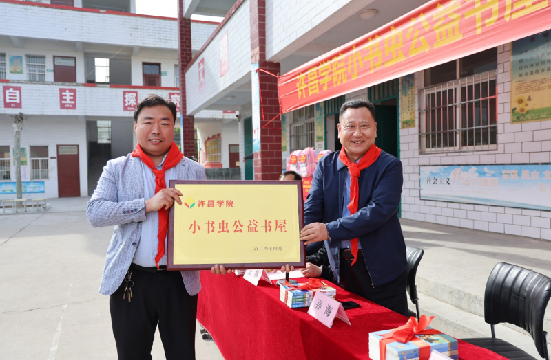 儀(yi) 式上,孫海為(wei) 關(guan) 爺廟小學校長授“許昌學院小書(shu) 蟲公益書(shu) 屋”牌匾。