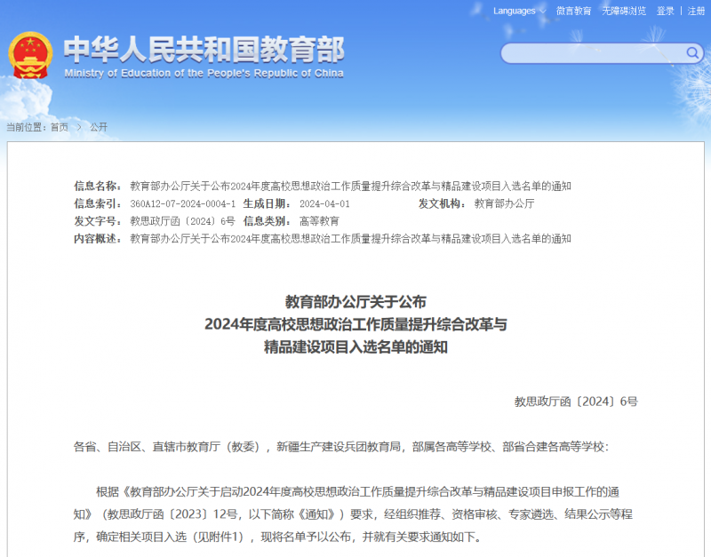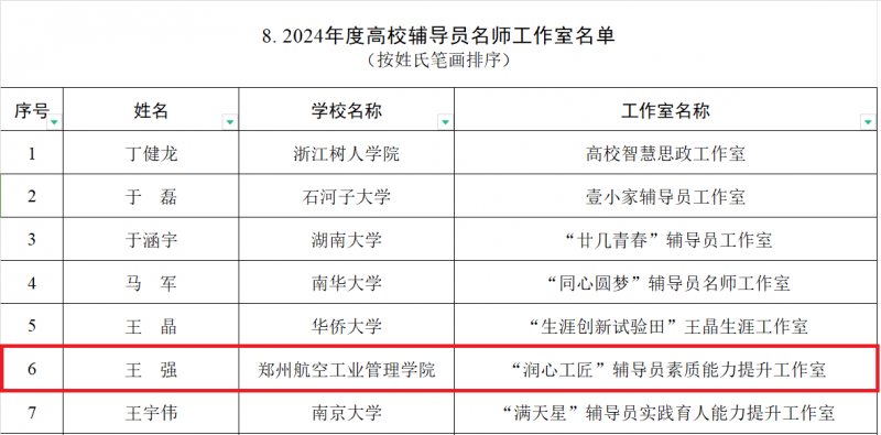 近日,教育部公布《2024年度高校思想政治工作質量提升綜合改革與(yu) 精品建設項目入選名單的通知》(教思政廳函〔2024〕6號),鄭州航空工業(ye) 管理學院王強主持建設的“潤心工匠工作室”成功入選國家級輔導員名師工作室,此次係教育部首次評選全國高校輔導員名師工作室(全國80項,河南省3項)。