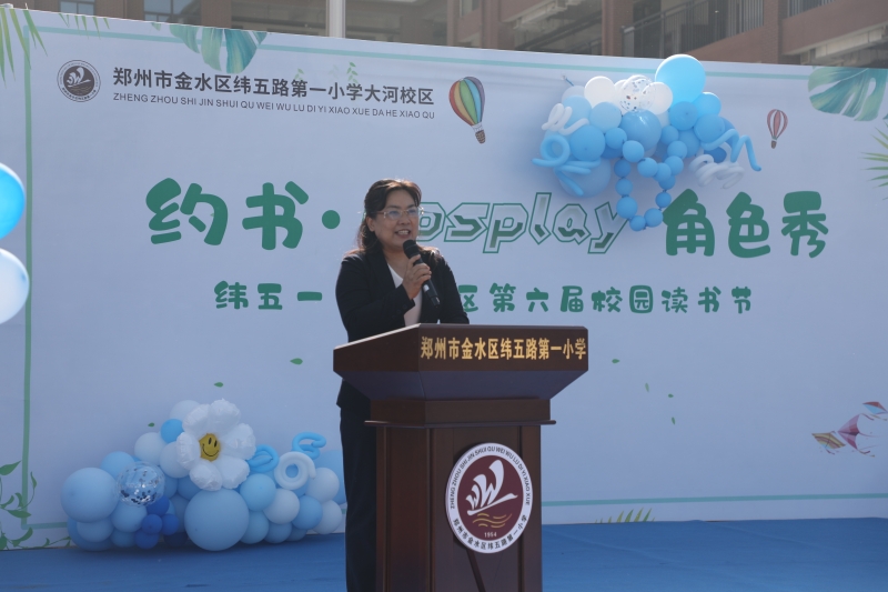 鄭州市緯五路第一小學教育集團黨(dang) 總支書(shu) 記、校長張麗(li) 娟為(wei) 本次活動致辭,鼓勵全體(ti) 師生、家長,在這充滿書(shu) 香的校園裏,通過閱讀讓孩子們(men) 感受生活,感悟生活的真諦。同時,希望大河校園的書(shu) 香彌漫到整個(ge) 楊金社區,推動社會(hui) 文明的發展。