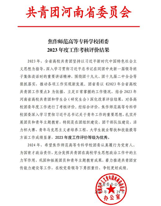 近日,共青團河南省委通報了全省高校共青團2023年度工作考核評價(jia) 結果,焦作師範高等專(zhuan) 科學校共青團工作在考核評價(jia) 中獲評“優(you) 秀”等級。