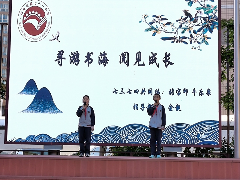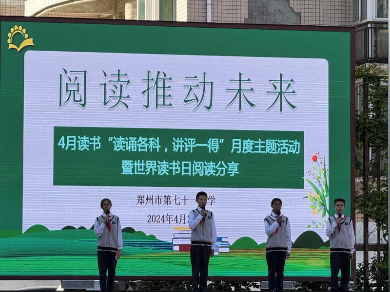 4月23日下午,鄭州市第七十一中學舉(ju) 行了“閱讀推動未來”4月讀書(shu) “讀誦各科 講評一得”主題活動暨世界讀書(shu) 日閱讀分享會(hui) 。學校黨(dang) 總支書(shu) 記徐建誌,黨(dang) 總支副書(shu) 記、校長孫愛軍(jun) ,黨(dang) 總支專(zhuan) 職副書(shu) 記陳廣融,黨(dang) 總支紀檢委員副校長吳戰利,黨(dang) 總支組織委員、副校長趙全發,教務處主任王潔,政教處主任宋俊美,辦公室主任王冰,及七年級全體(ti) 師生參加此次活動。