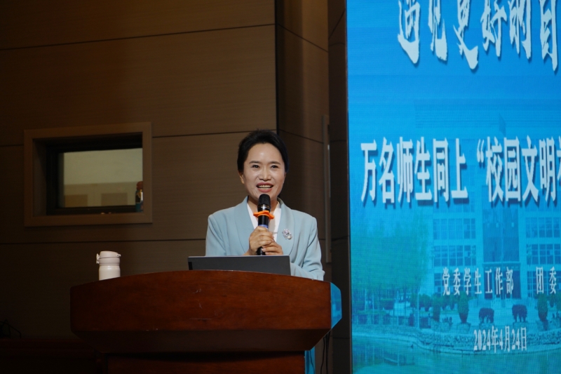 為(wei) 弘揚中華民族禮儀(yi) 文化,深入推進鄭州工程技術學院文明禮儀(yi) 教育,提升師生的文明素養(yang) ,促進校園文明風尚的形成,以飽滿向上的精神風貌迎接教育部本科教學工作合格評估,4月24日下午,鄭州工程技術學院近2萬(wan) 名師生采用線上線下互動的方式,同上一堂“遇見更好的自己·校園文明禮儀(yi) ”課。主會(hui) 場設在金河校區圖書(shu) 館一樓報告廳,分會(hui) 場各班級以主題班會(hui) 和主題團課的形式線上組織觀看。黨(dang) 委副書(shu) 記、工會(hui) 主席焦紅波主持並講話。