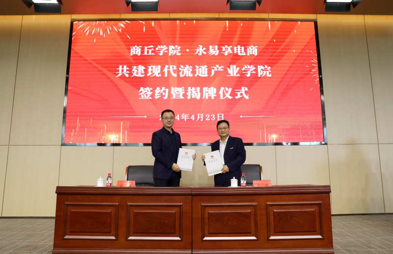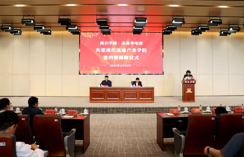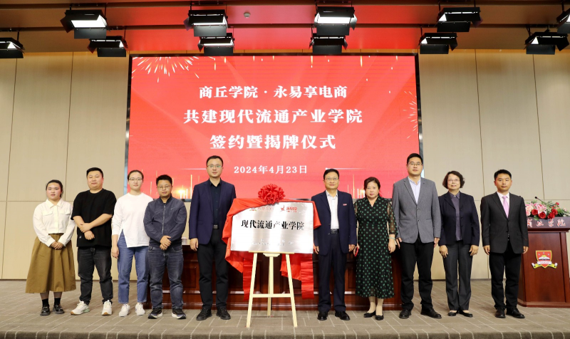 雙向奔赴,合作共贏,4月23日,商丘學院與(yu) 永易享電商共建“現代流通產(chan) 業(ye) 學院”簽約暨揭牌儀(yi) 式在我校圖書(shu) 館多功能報告廳順利舉(ju) 行。雙方就建設“現代流通產(chan) 業(ye) 學院”、深化產(chan) 教融合、校企協同育人等內(nei) 容達成共識。副校長潘一展主持揭牌儀(yi) 式。