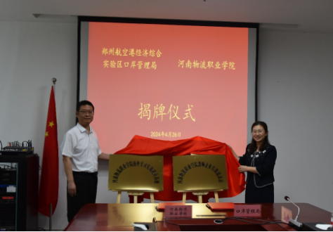 河南物流職業(ye) 學院校長陶海東(dong) 與(yu) 鄭州航空港經濟綜合實驗區口岸管理局局長郭利超共同為(wei) “河南物流職業(ye) 學院校外實習(xi) 實訓就業(ye) 基地”“河南物流職業(ye) 學院教師企業(ye) 實踐流動站”揭牌。