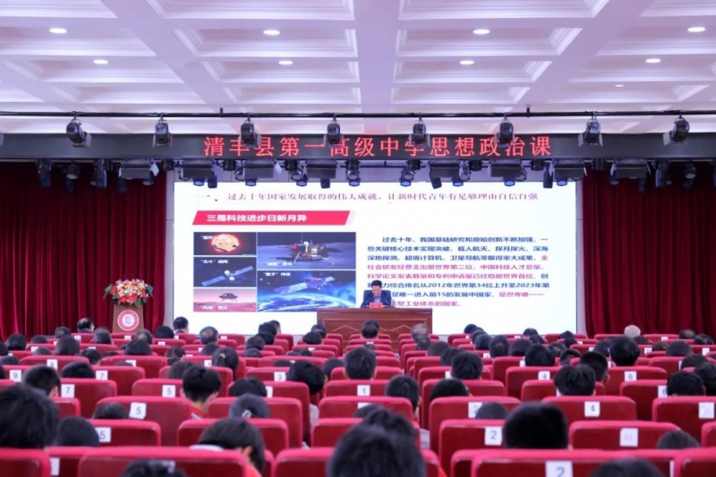 清豐(feng) 一高400餘(yu) 名學生和100餘(yu) 名教師代表聆聽思政課。整堂課內(nei) 容豐(feng) 富,既有理論的高度,又有思想的深度,還有殷切的期望和深切的勉勵,具有很強的理論性、針對性和指導性,贏得了現場師生的陣陣掌聲。
