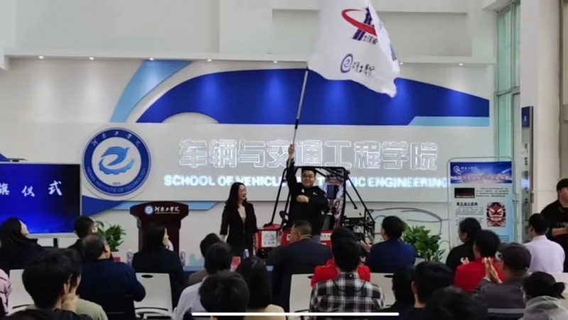 劉校長為(wei) 太行車隊授旗,車隊指導胡延明老師接過旗幟,飄舞的旗幟展現了車隊拚搏、共創、勤懇、鑽研、的車隊理念,發揚“開拓進取 自強不息”的精神。