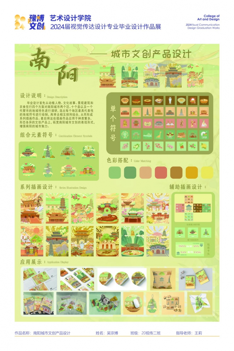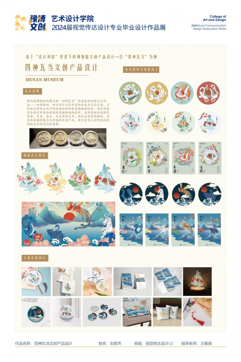 本次畢業(ye) 設計作品展涵蓋了文創產(chan) 品設計、品牌形象設計、IP設計、包裝設計、書(shu) 籍設計、UI界麵設計等多個(ge) 方麵。其最顯著特點就是緊扣中原文化、圍繞豫博文創板塊選題設計,獨具匠心展示中原文化的意蘊。“四神瓦當”文創產(chan) 品設計將河南博物院文物“四神瓦當”所承載的四季輪回、四方安寧文化內(nei) 涵,將傳(chuan) 統文化經典紋樣與(yu) 色彩巧妙搭配結合,進行符合現代審美的新國風風格插畫設計,具有創新性、實用性和獨特魅力。“豫想靈瑞”IP形象設計以河南博物院珍藏的神獸(shou) 類青銅器為(wei) 設計靈感,以神獸(shou) 類青銅器中的神秘形象和精美紋飾為(wei) 設計基調,結合現代審美和生活需求,創造出獨具特色的文創產(chan) 品。既尊重曆史傳(chuan) 統,又賦予產(chan) 品新的時代意義(yi) 。“豫你桐在”IP形象以剪紙效果為(wei) 主,加以版畫形式的創新,以“焦裕祿精神、蘭(lan) 考縣、泡桐花”為(wei) 三大分支進行海報設計,可以吸引更多年輕人了解蘭(lan) 考紅色文化和剪紙這一優(you) 秀國家級非物質文化遺產(chan) 。“豫音嫋嫋”鄭州方言文創產(chan) 品設計以鄭州方言為(wei) 靈感來源,通過插畫與(yu) 字體(ti) 結合的設計手法,將這一文化元素融入產(chan) 品之中,讓更多的人了解和感受到鄭州方言的魅力。“南陽城市”文創產(chan) 品設計從(cong) 動植人物、文化故事、景觀建築和衣食住行四個(ge) 方麵選出南陽城市兩(liang) 個(ge) 區、十個(ge) 縣以及一個(ge) 代管市最具代表性的地域符號進行繪製,形成係列插畫作品,並將其應用於(yu) 種類繁多、形態各異的文創產(chan) 品上,既拓寬南陽城市文創的表現形式,又增強了南陽的城市魅力。