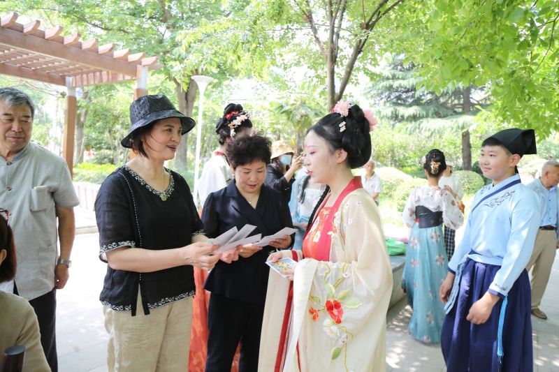 在3600年的商城遺址下,身著漢服的黃河路第二小學的同學、家長,以及學校老師代表,親(qin) 手為(wei) 市民群眾(zhong) 送上學生們(men) 的“守護國寶文創作品”明信片,介紹明信片上文物背後的故事,希望更多的人來守護國家文物,了解中華民族的悠久曆史。